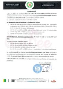 Dans un communiqué transmis à la rédaction de Guineeactusociale.com, la Direction Générale de la Caisse Nationale de Sécurité Sociale (CNSS) informe les pensionnés que le versement des pensions de retraite et de réversion de l’échéance d’Août 2024 débutera le mardi 06 Août 2024 à 8 heures 00 sur toute l’étendue du territoire national.