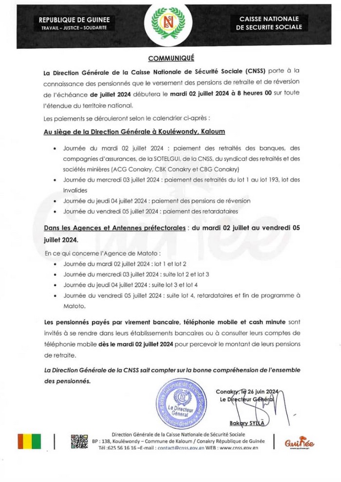 Dans un communiqué transmis à la rédaction de Guineeactusociale.com, la Direction Générale de la Caisse Nationale de Sécurité Sociale (CNSS) informe les pensionnés que le versement des pensions de retraite et de réversion de l’échéance de juillet 2024 débutera le mardi 02 juillet 2024 à 8 heures 00 sur toute l’étendue du territoire national.