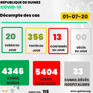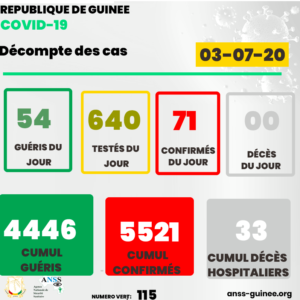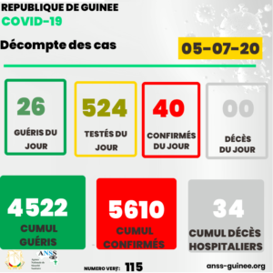 État des lieux hebdomadaire de l’évolution de la Covid-19 en Guinée. Du lundi 29 Juin à ce Dimanche 05 Juillet 2020, selon les statistiques quotidiennes fournies par l’Agence Nationale de la Sécurité Sanitaire (ANSS), la guinée a enregistré 240 guéris contre 268 cas confirmés, et 3 décès hospitaliers dont deux le Mardi 30 Juin, et un autre le samedi 04 juillet 2020.