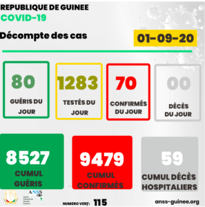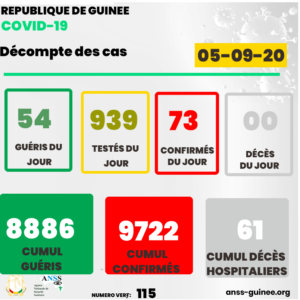 Du lundi 31 A août 2020 au Dimanche 06 Septembre 2020, selon les statistiques quotidiennes fournies par l’Agence Nationale de la Sécurité Sanitaire (ANSS), la guinée a enregistré 427 cas confirmés contre 541 guéris.