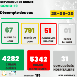 État des lieux hebdomadaire de l’évolution de la Covid-19 en Guinée. Du lundi 22 à ce Dimanche 28 juin 2020, selon les statistiques quotidiennes fournies par l’Agence Nationale de la Sécurité Sanitaire (ANSS), la guinée a enregistré 613 Guéris contre 354 Cas confirmés, et 4 décès hospitaliers dont 1er survenu le lundi 22 Juin, le second le mardi 23 Juin, le troisième le samedi 27 Juin et le quatrième cas de décès survenu ce Dimanche 28 Juin 2020.